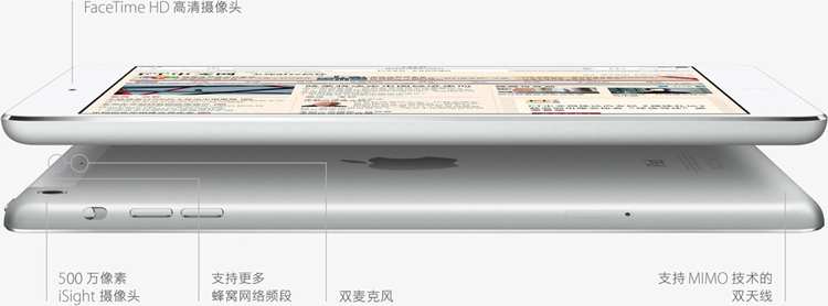 ipad mini 的机身仅有 7.5 毫米之薄,却满载一系列能为你带来出色体验的先进技术。ipad mini 为随身而行所设计,因此采用两条天线来支持 mimo (多输入多输出) 技术,以实现快达 2 倍的 802.11n 无线网络连接速度。 而 wlan cellular 机型还支持世界各地的更多网络,因此 ipad mini 可让你在更多地方保持网络连接1。另外,它还配备了 500 万像素 isight 摄像头和 facetime hd 高清摄像头。其传感器经过优化,可以让视频通话效果更出色2。此外,双麦克风可为视频拍摄、facetime 视频通话和 siri 语音识别提升音质和过滤背景噪音。所有这一切重量级科技,都巧妙整合于平润光滑、轻而易举的机身框架之中。