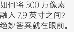 要为 ipad mini 配备 retina 显示屏,我们必须先要找到一个合理的方式,将 9.7 英寸 ipad 显示屏的 310 万像素悉数置入 7.9 英寸显示屏之中。事实上,显示屏中的每个像素都有多个信号来控制其何时点亮。而当显示屏分辨率达到 2048 x 1536 像素时,会有更多像素和信号紧密地排列在同一平面上,这将导致信号混杂交叉,引起图像质量的下降。为了确保 ipad mini 上的一切都看起来清晰明锐,apple 工程师将像素提升到不同的平面,使其与信号分开。这一创举的最终成效,是使像素密度跃升至 326 ppi。这时肉眼已辨识不出单个像素,因此一切看起来都极为细腻、生动、清晰。